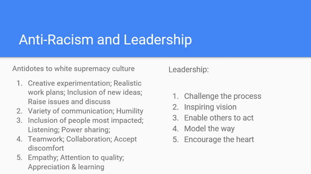 - Address it – Co-creation of actions based on antidotes to white supremacy culture and effective leadership practices with all three key stakeholder groups