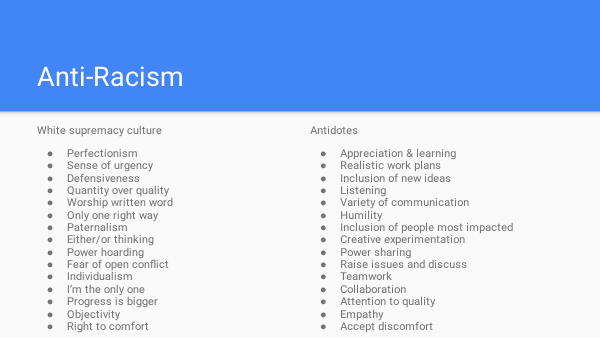 After a quick review practice of identifying challenges from power between the three groups in nonprofit organizations, we quickly reviewed the characteristics of and the antidotes to white supremacy culture.