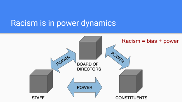 At a recent session during the Washington State Nonprofit Conference, we attempted to tackle this challenge. Our premise started with the understanding that there are 3 expressions of racism: cultural, personal, and institutional. In nonprofit institutions we create new knowledge about how to apply anti-racism “at home” for and with the people in the sector. Using the premise that institutional racism is expressed when there is both bias and power.