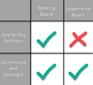 Working boards are more hands-on, and often take on tasks that would be assigned to staff in a larger or more well-resourced organization, whereas governing boards will be more responsible for strategy, financial oversight, and upholding the mission.
